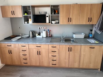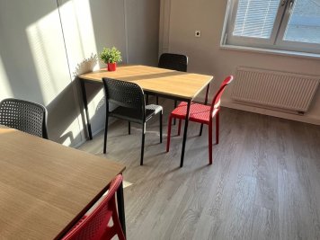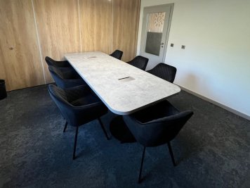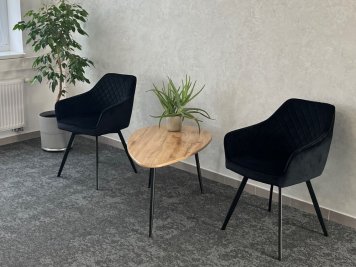 Ve vstupní recepci jsme umístili konferenční stolek TURPIN, doplněný otočnými jednacími židlemi YELD, které se opakují i v jednacích místnostech. Pro kuchyňku jsme zvolili šedé židle BORA s vysokou nosností a oživili je červenou barvou 2 židlí.